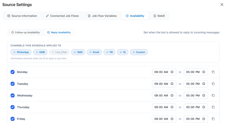 Reply hour restrictions don’t have to apply universally. You can set rules by channel. Your AI might operate 24/7 on email, Facebook Messenger, and WhatsApp, while limiting SMS replies to business hours only.