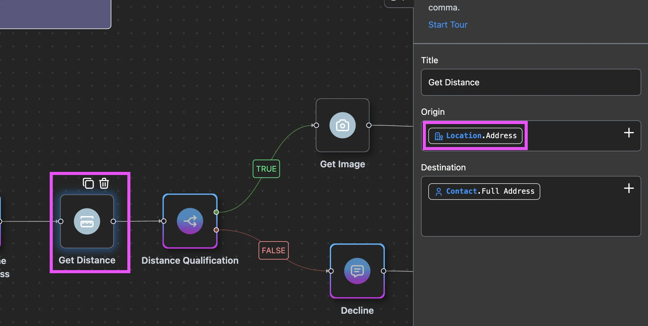 For example, this job flow is set up to conversationally qualify plumbing leads depending on the distance from the business address. Using a variable here will mean the business will be required to input this variable to be able to test out this demo experience.