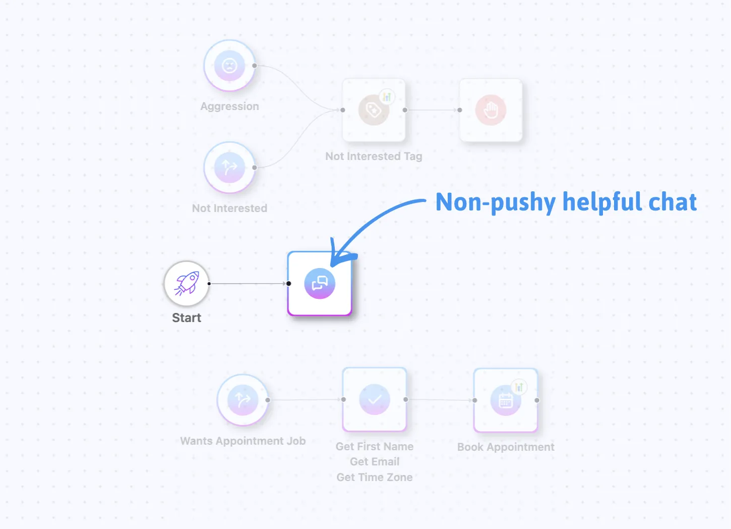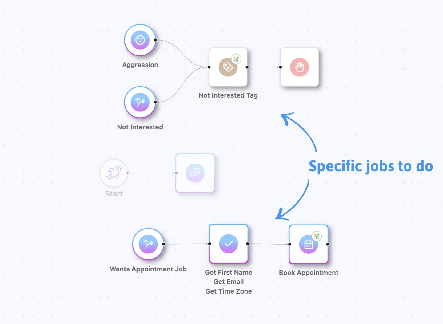 Designing effective conversational pathways requires a clear understanding of the customer journey. Best practices include mapping out the different core jobs you want your AI to be able to perform (i.e. appointment booking, qualifying criteria). All CloseBot agents can answer questions at any stage. Answering questions does not have to be built out as a flow.