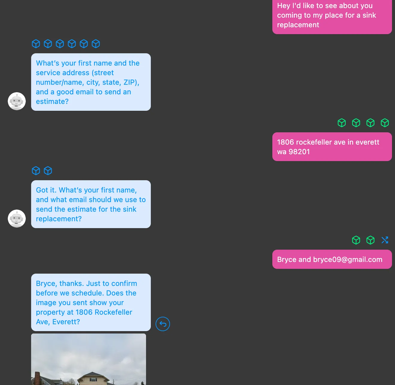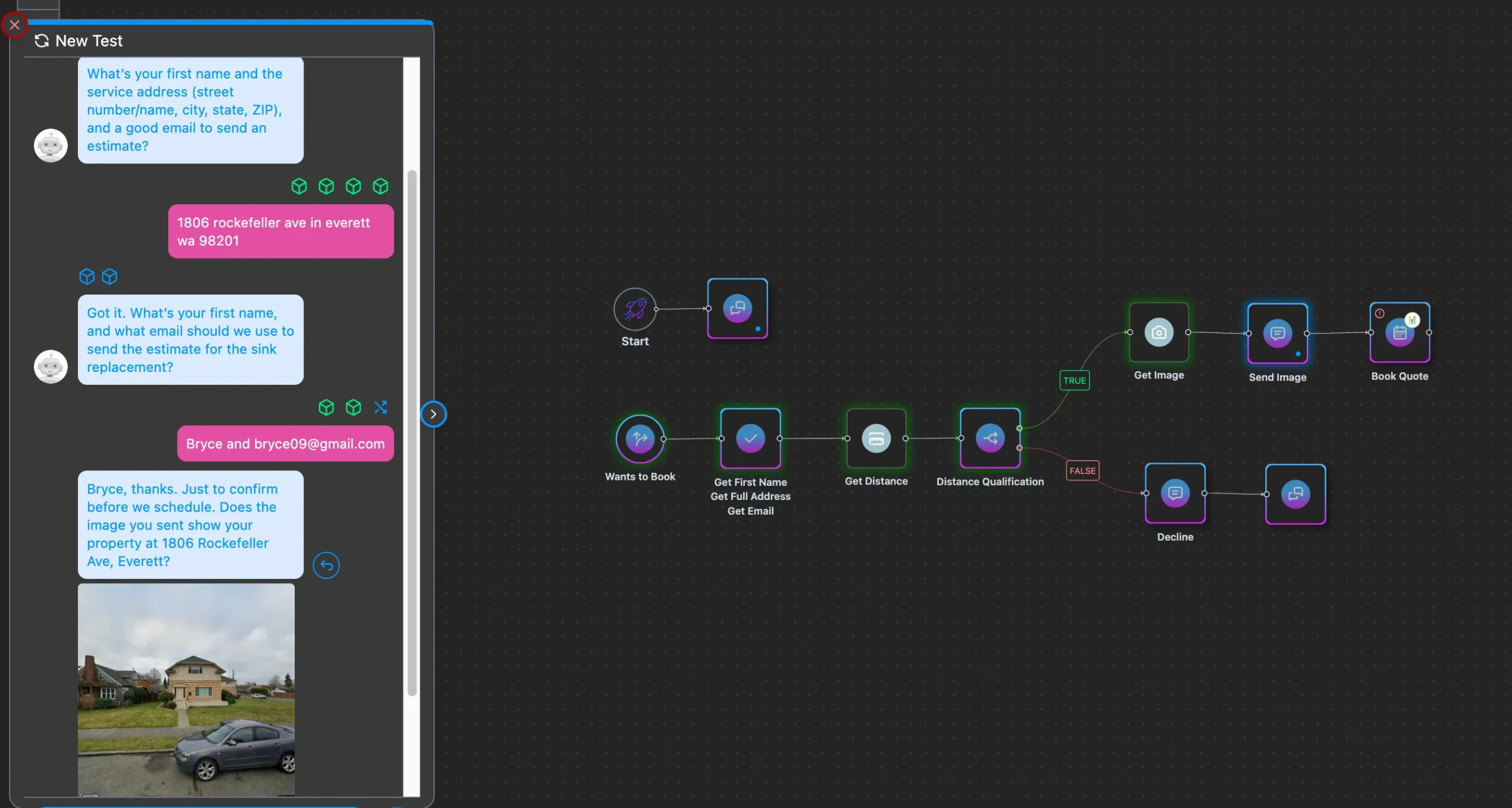 Similar to the build example for plumbers above, check out this live build where we show you how you can build a roofing sales AI that is able to gather property details from online after conversationally obtaining the lead address and send an image of the property before conversationally scheduling an appointment for the roofer.